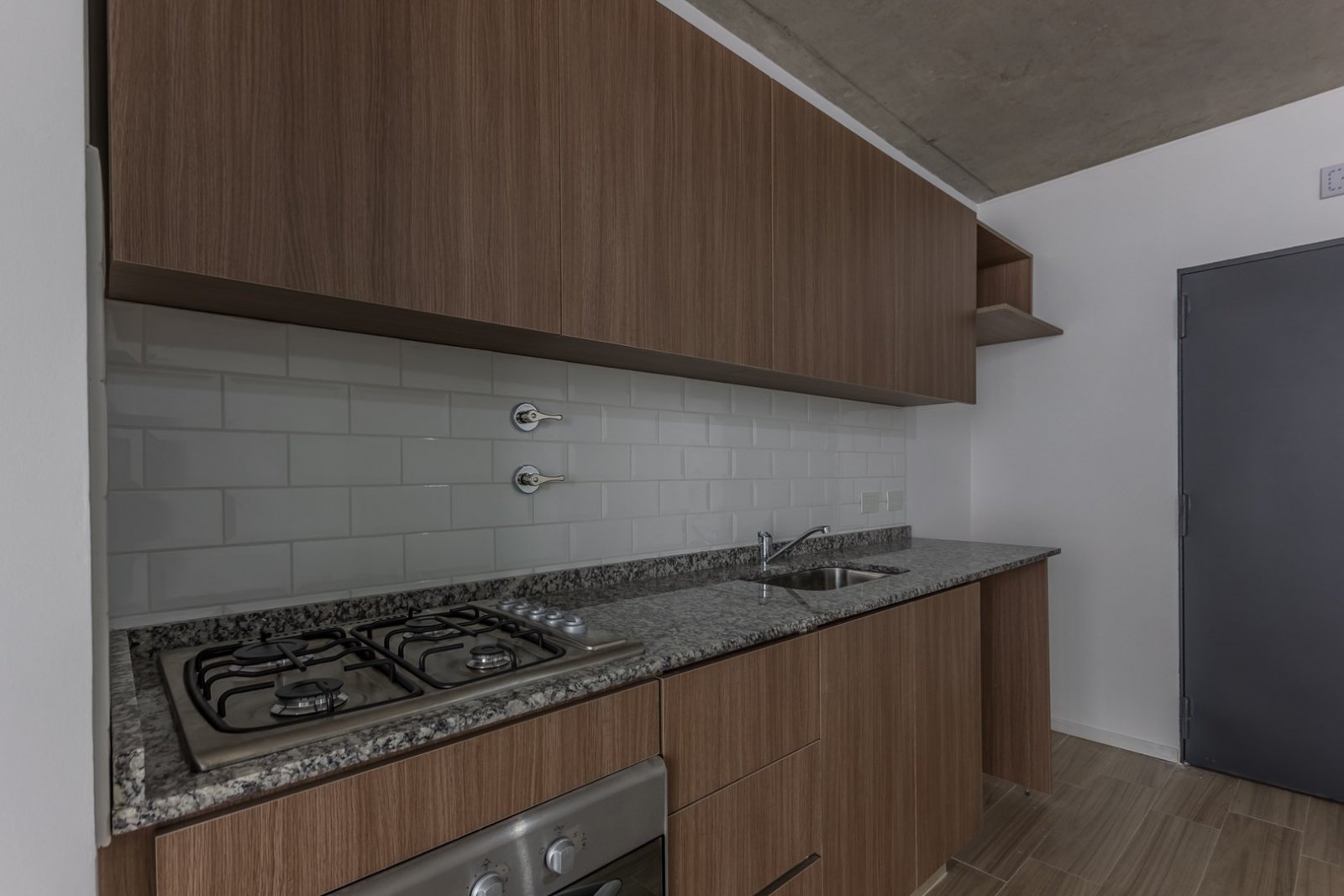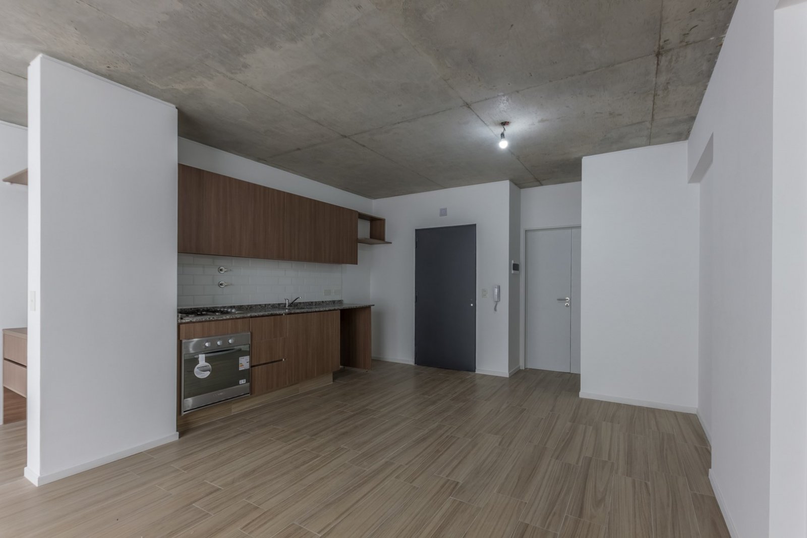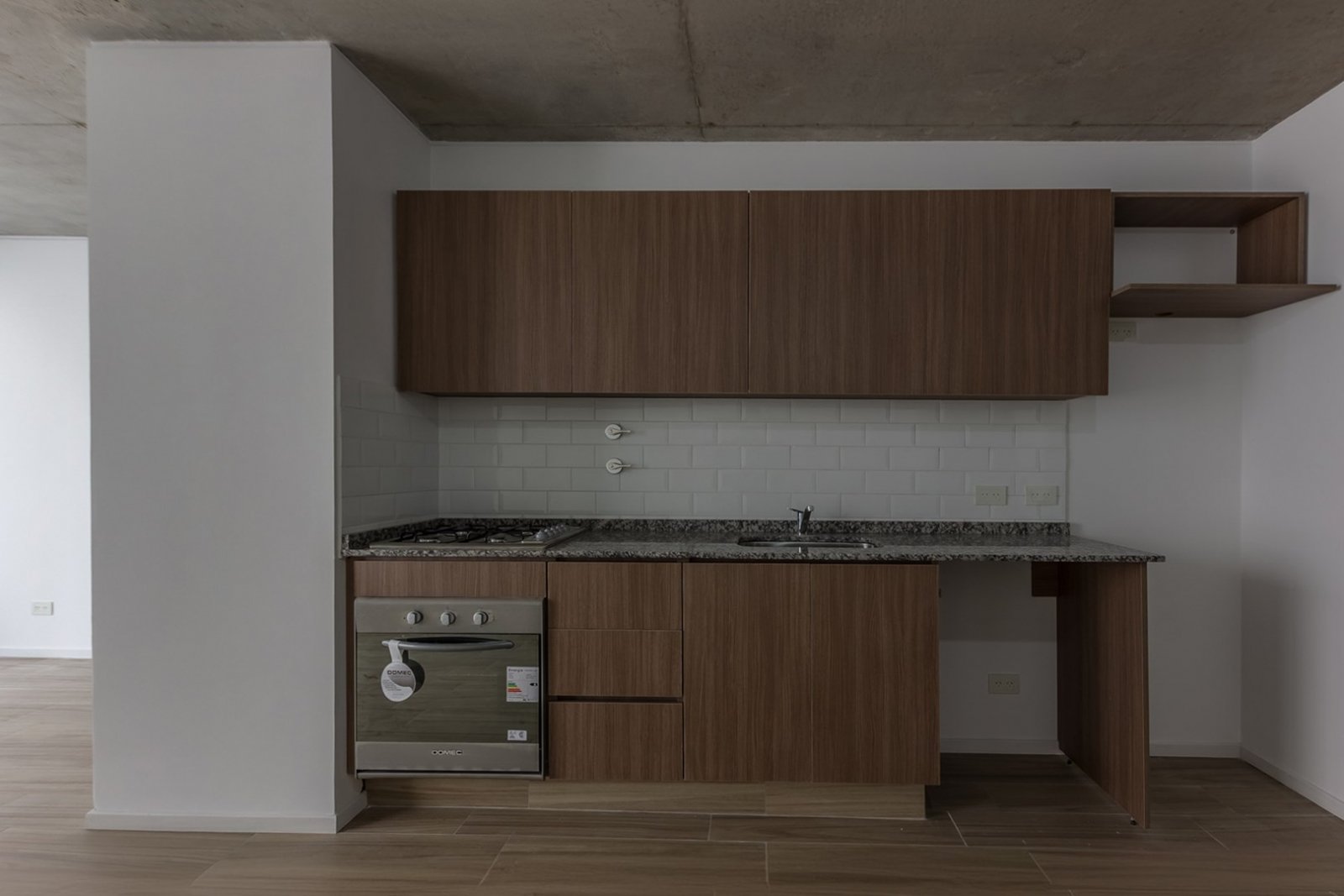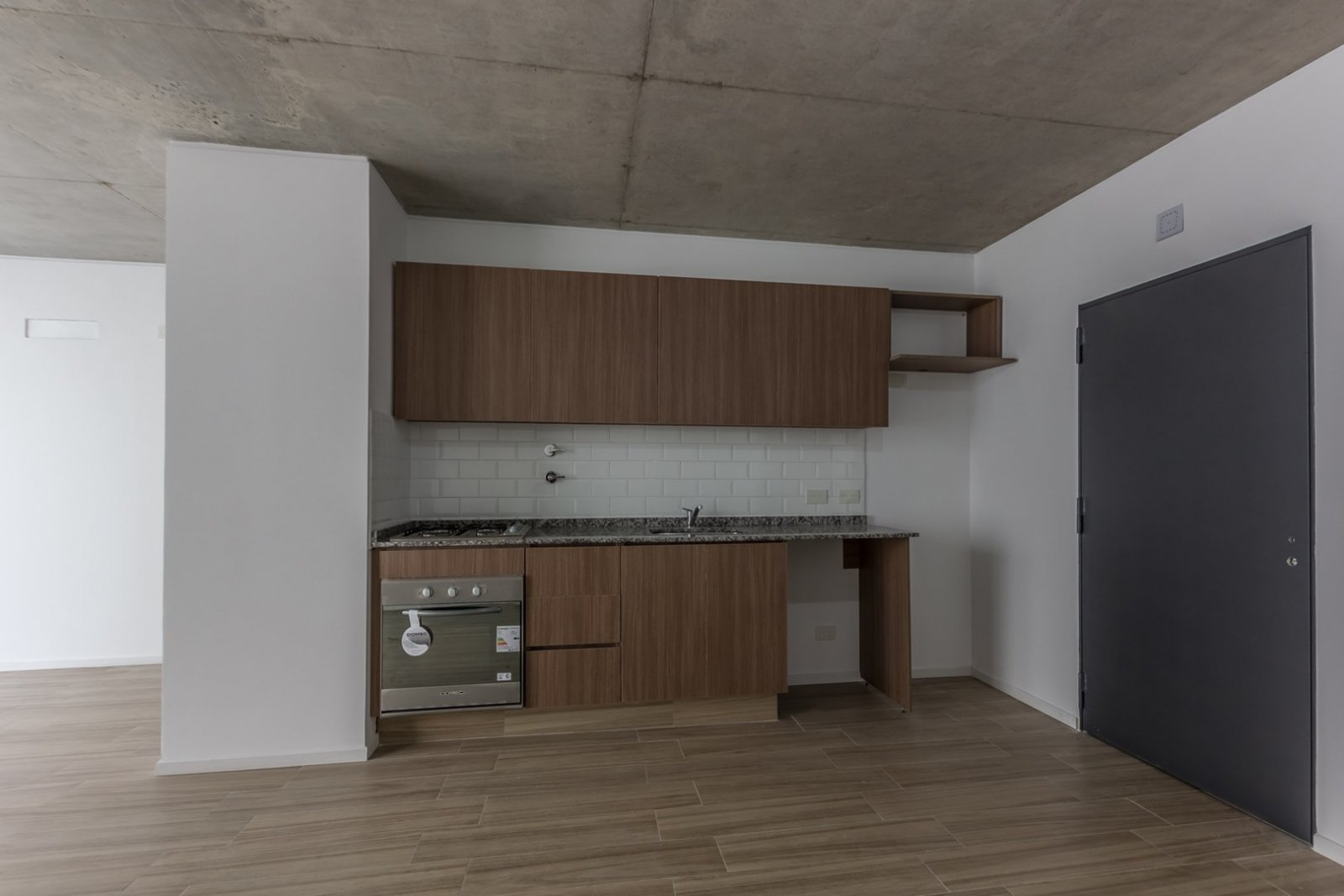 El departamento cuenta con cocina y horno empotrado a gas, Amoblamientos de cocina: bajo mesada y alacena en melanina y madera touch con detalles de diseño. Mesada y alzada de granito gris mara. Bacha de acero inoxidable marca "Mi Pileta". Grifería monologando marca FV o Peirano. Pre instalación para equipos split frío/calor. Agua caliente central. Pisos de porcellanato. Ventanas de aluminio repintado línea Modena o similar. Puertas exterior chapa n°18 y hoja pesada F30. Puertas interior: marco de chapa n°18 y hoja MDF.
