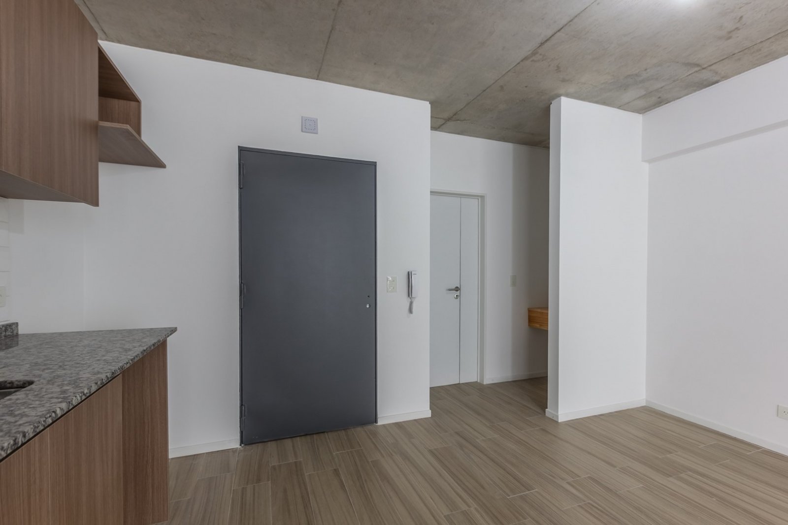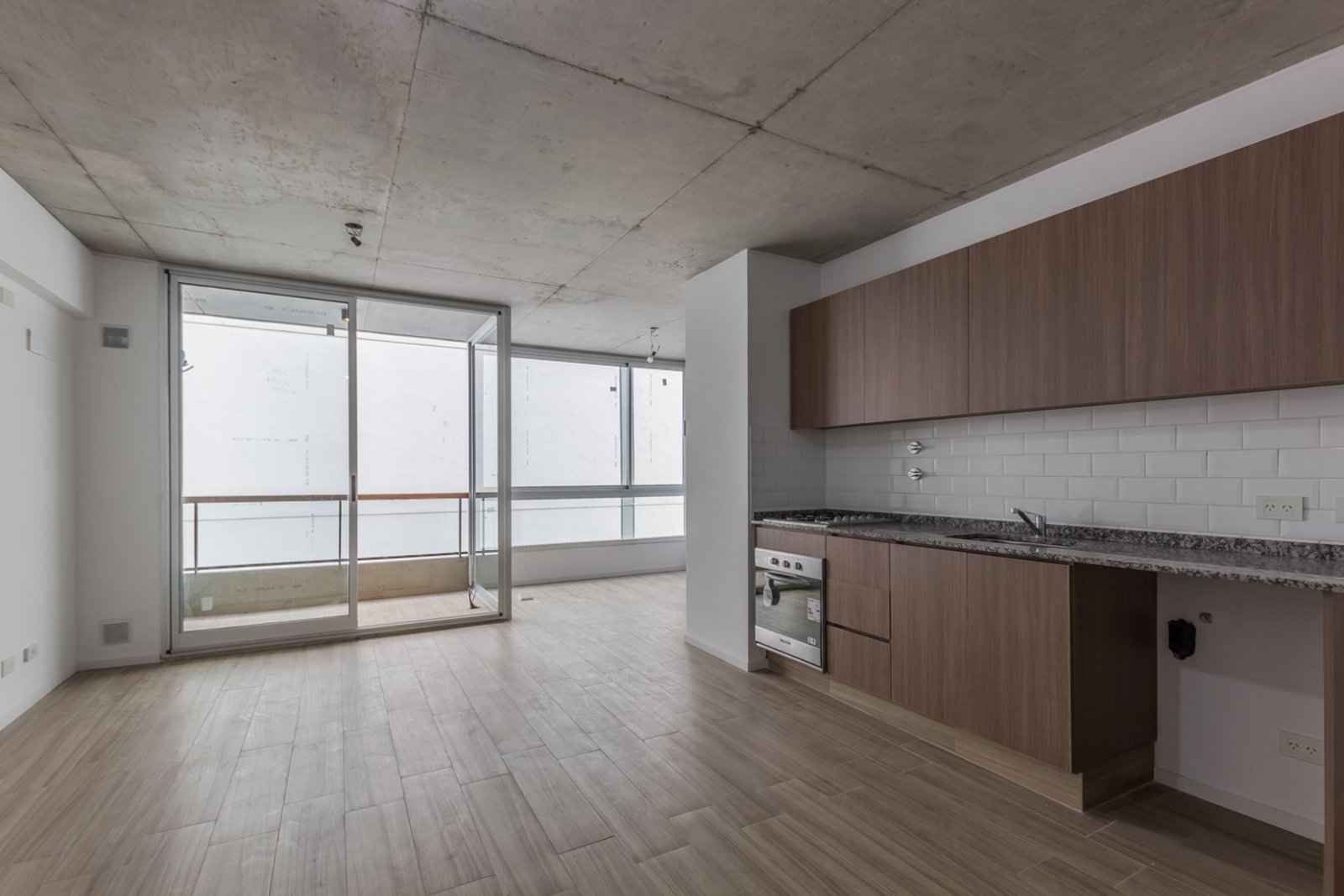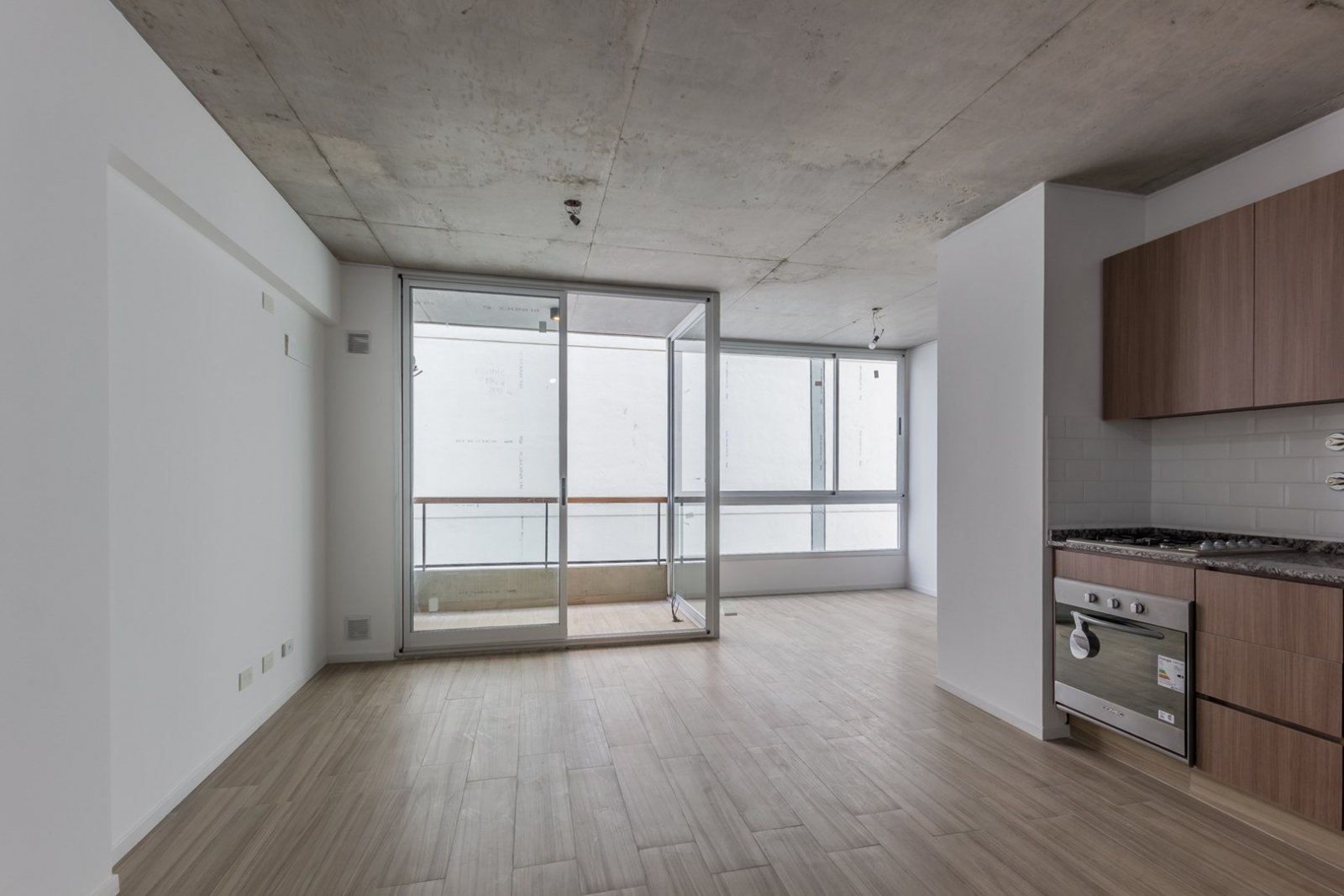 El departamento cuenta con cocina y horno empotrado a gas, Amoblamientos de cocina: bajo mesada y alacena en melanina y madera touch con detalles de diseño. Mesada y alzada de granito gris mara. Bacha de acero inoxidable marca "Mi Pileta". Grifería monologando marca FV o Peirano. Pre instalación para equipos split frío/calor. Agua caliente central. Pisos de porcellanato. Ventanas de aluminio repintado línea Modena o similar. Puertas exterior chapa n°18 y hoja pesada F30. Puertas interior: marco de chapa n°18 y hoja MDF.
