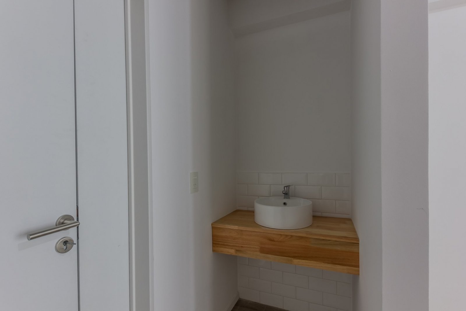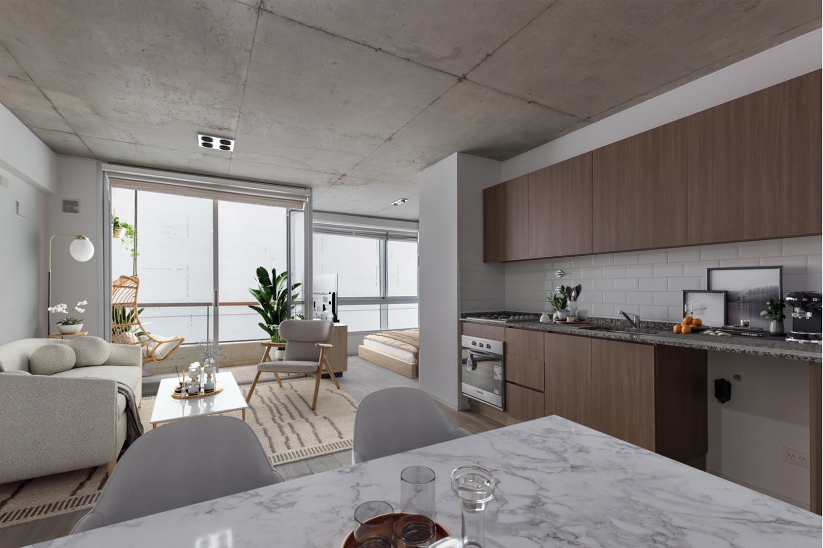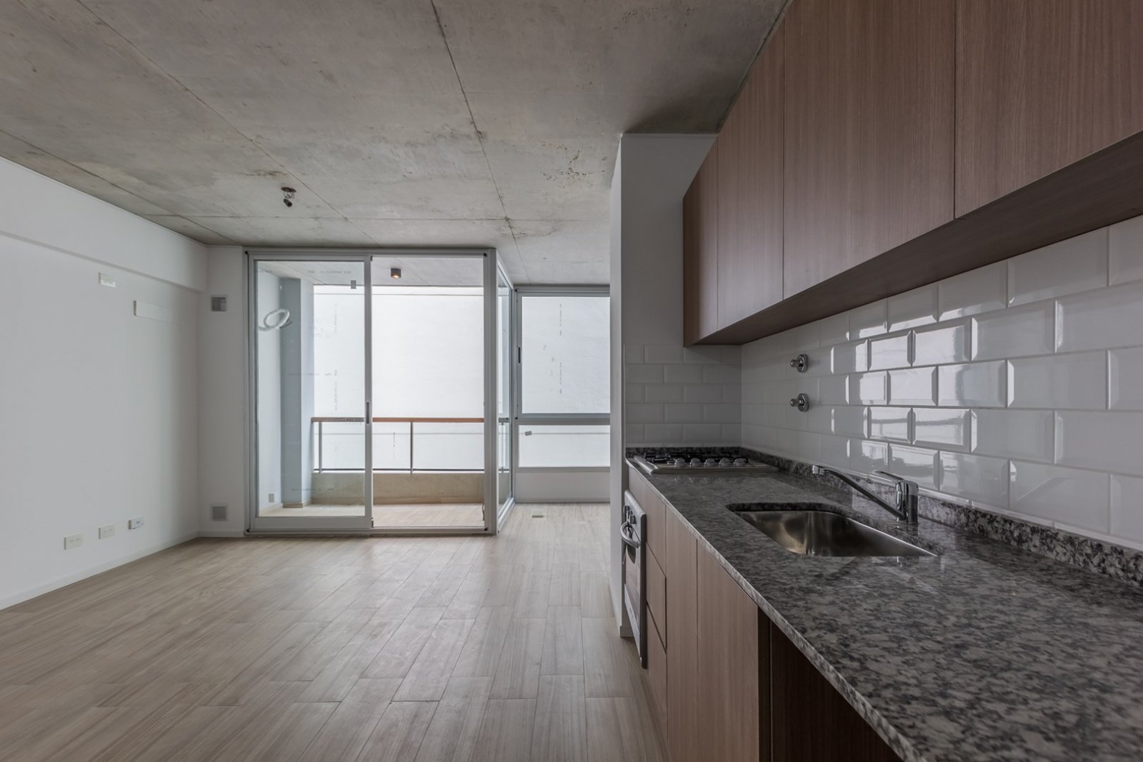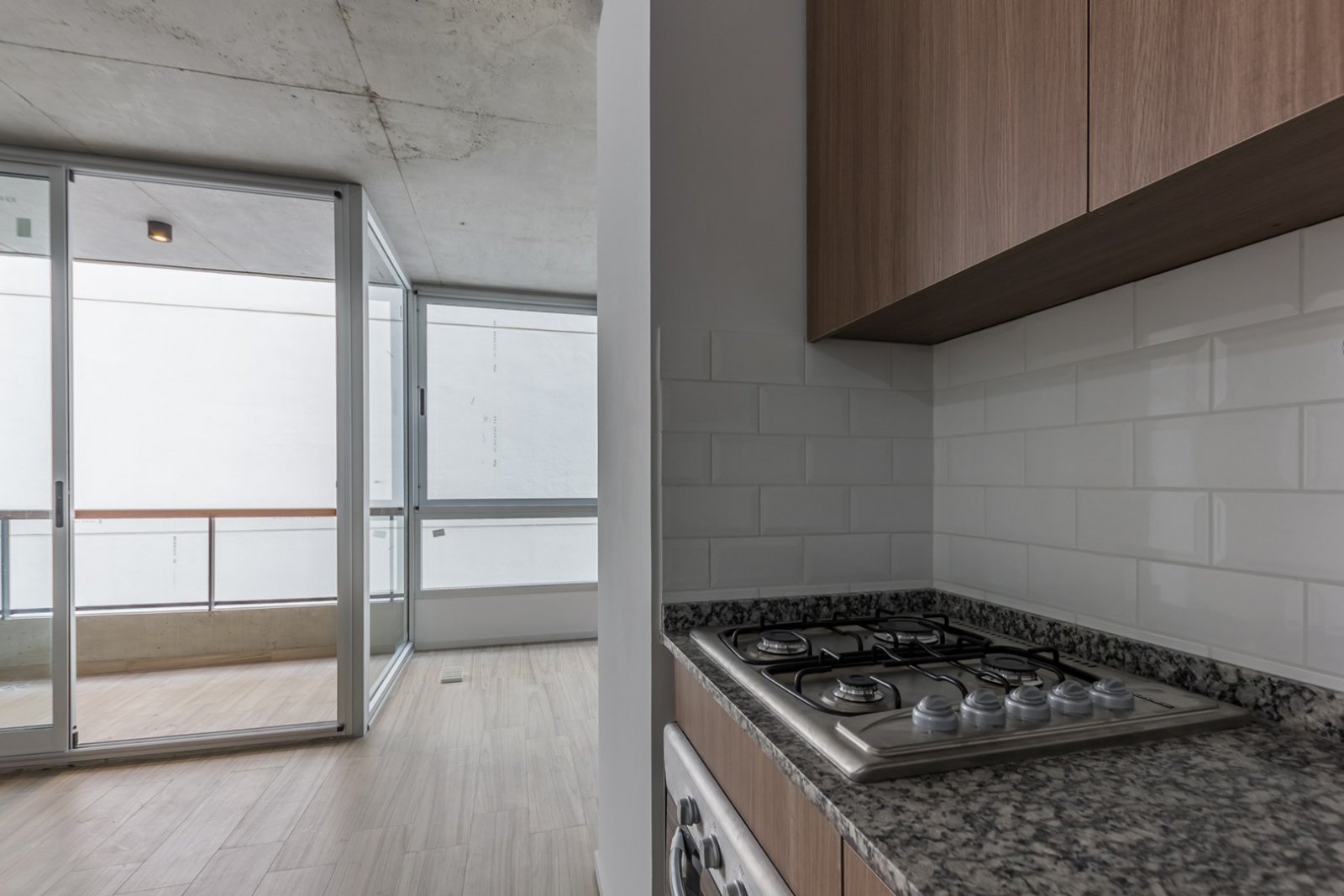 El departamento cuenta con cocina y horno empotrado a gas, Amoblamientos de cocina: bajo mesada y alacena en melanina y madera touch con detalles de diseño. Mesada y alzada de granito gris mara. Bacha de acero inoxidable marca "Mi Pileta". Grifería monologando marca FV o Peirano. Pre instalación para equipos split frío/calor. Agua caliente central. Pisos de porcellanato. Ventanas de aluminio repintado línea Modena o similar. Puertas exterior chapa n°18 y hoja pesada F30. Puertas interior: marco de chapa n°18 y hoja MDF.
