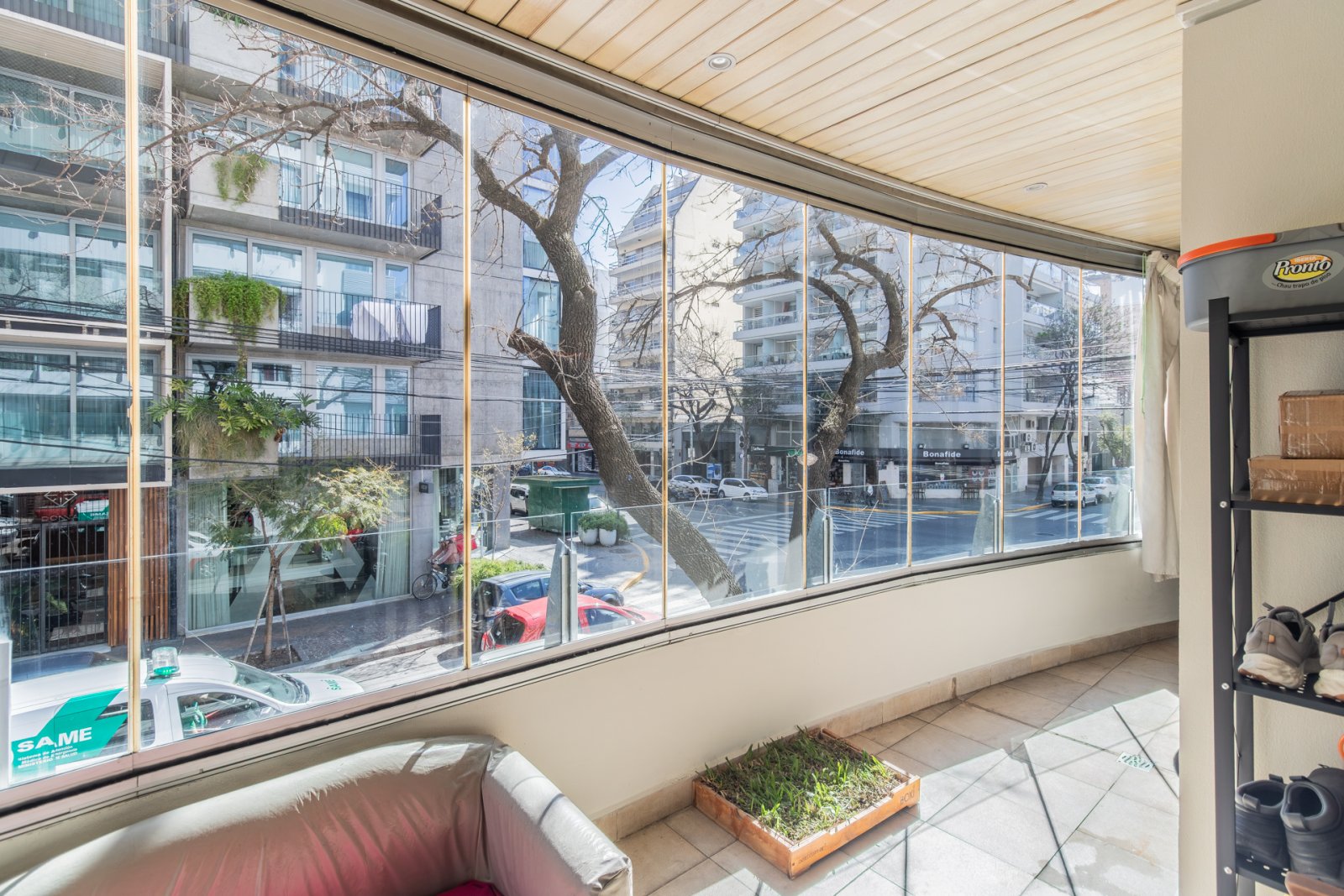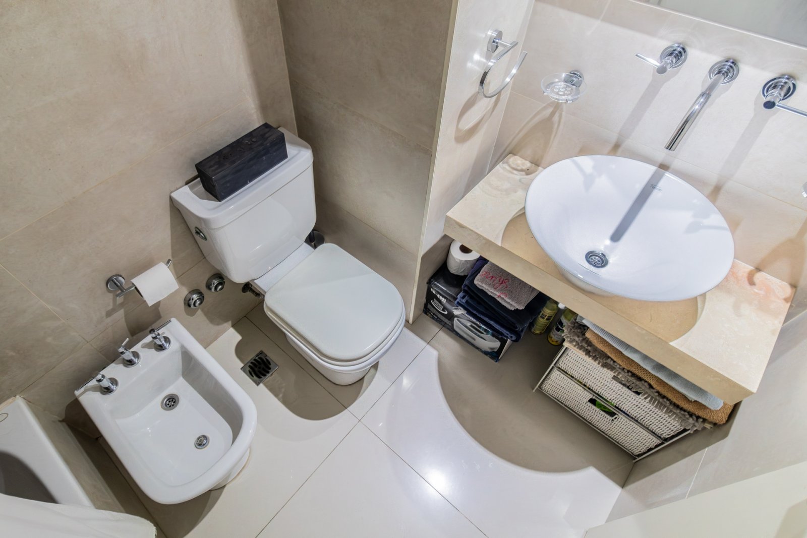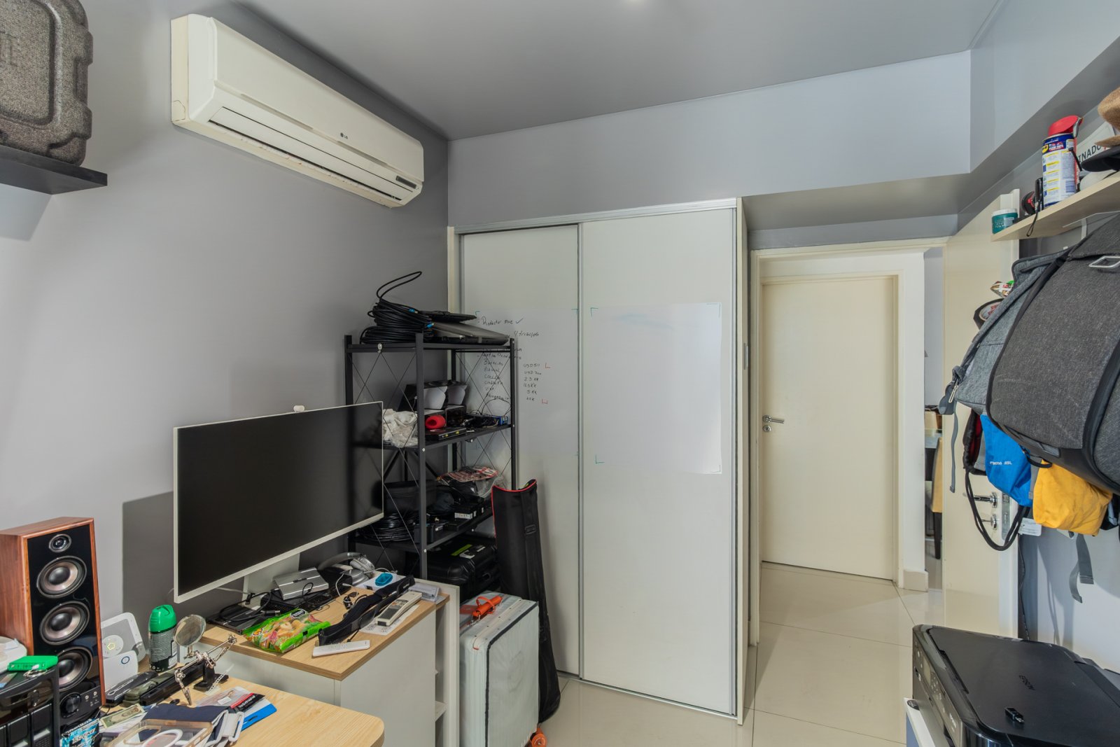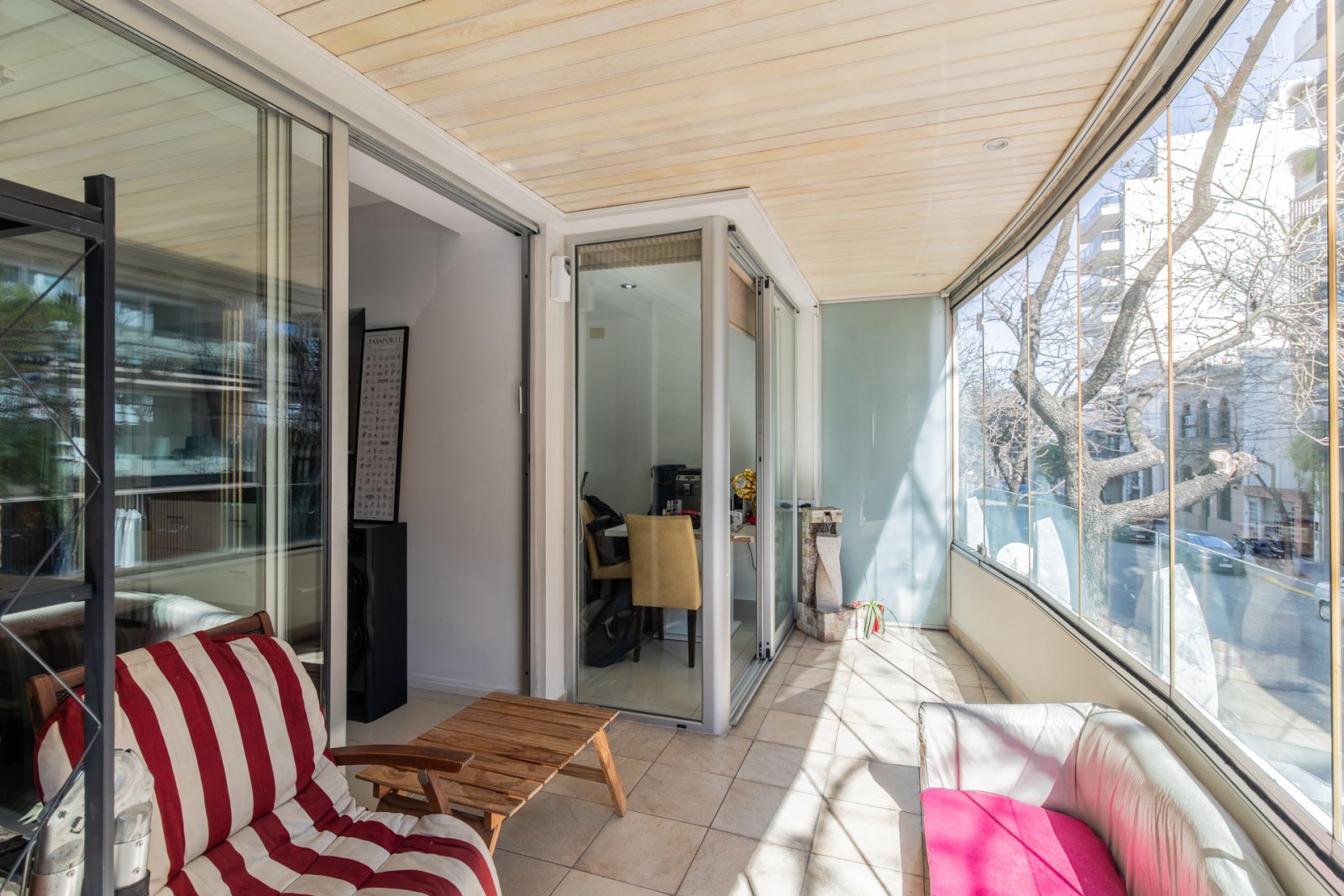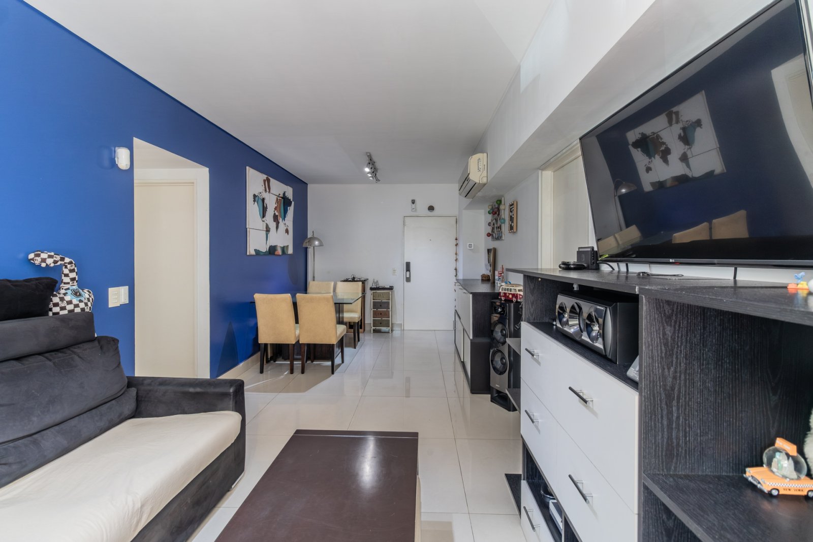 Departamento de 3 ambientes en venta. Dos dormitorios con placard, uno de ellos en suite. Baño completo adicional con antebaño. Amplio balcón al frente. Sistema de climatización frío-calor por aire. Agua caliente central. El espacio para el lavarropas en la cocina, actualmente se utiliza como lugar de guardado. Edificio con seguridad y amenities en los pisos superiores: pileta, fogonero, SUM, sauna, gimnasio.