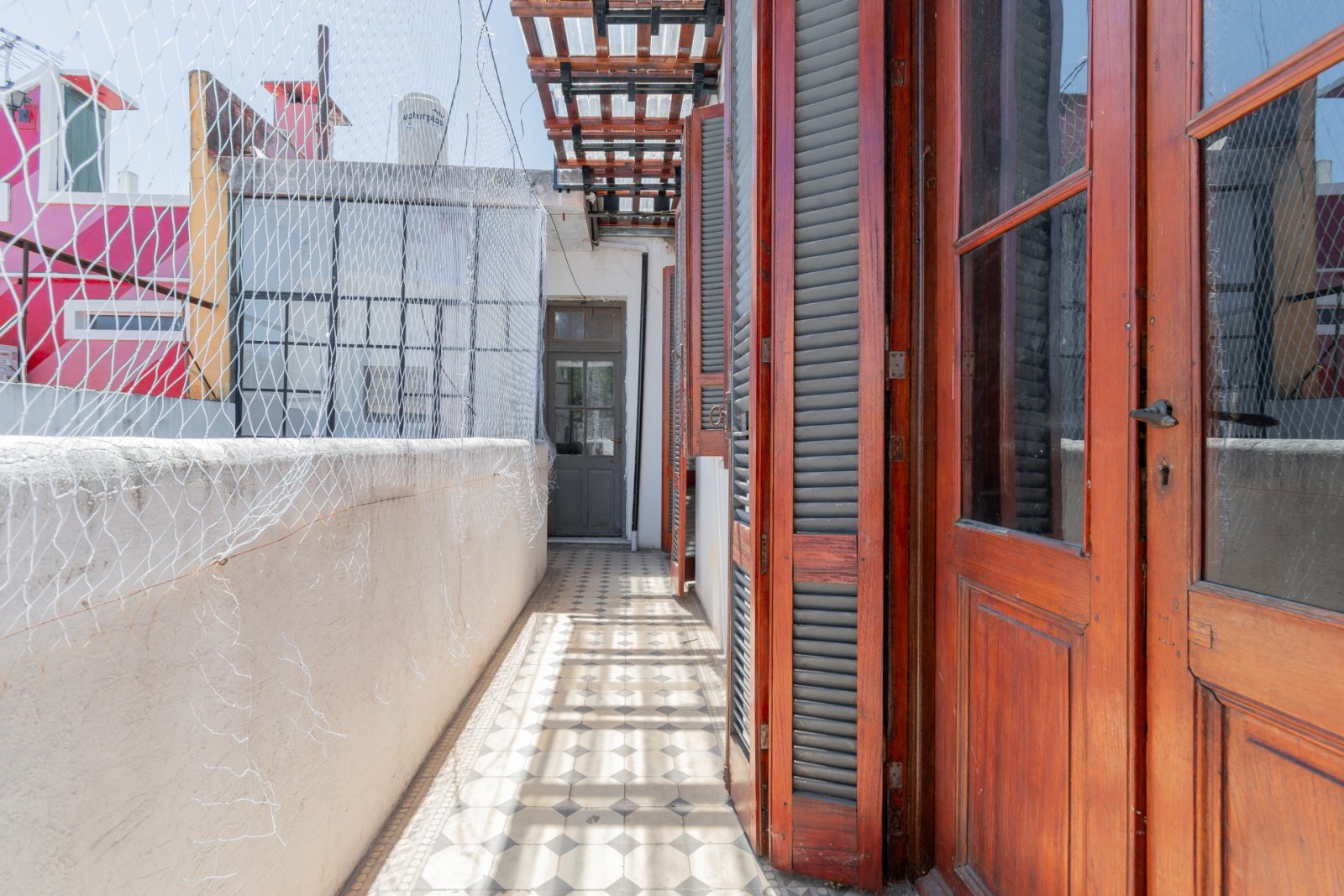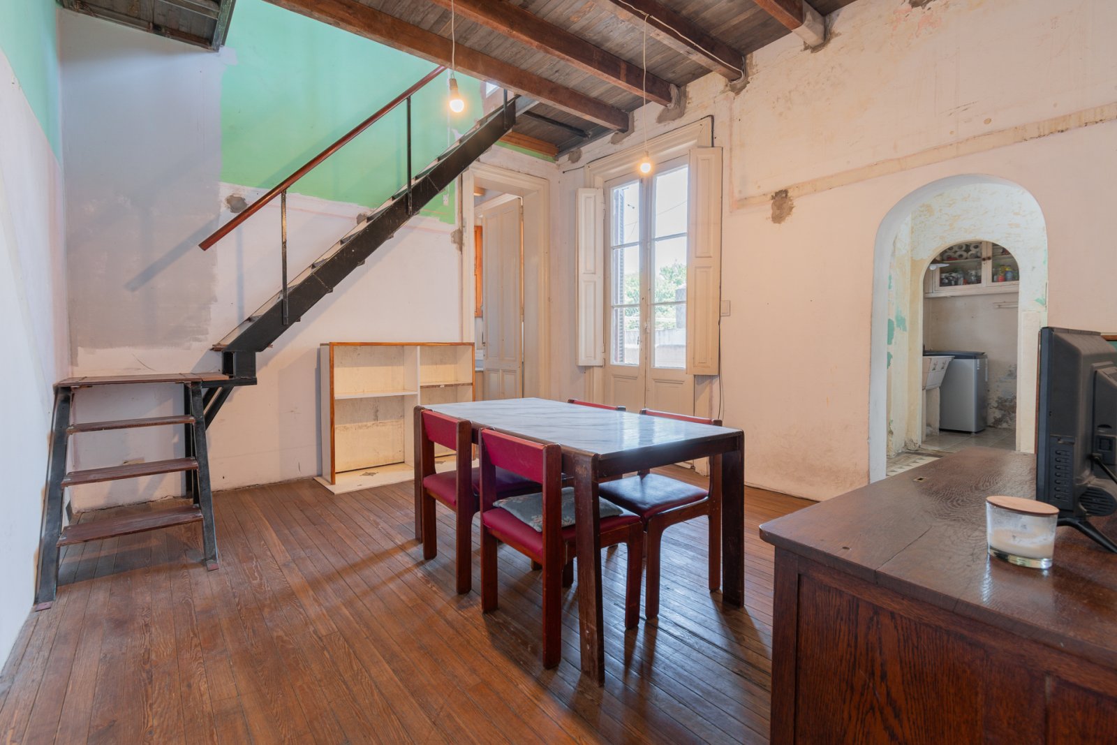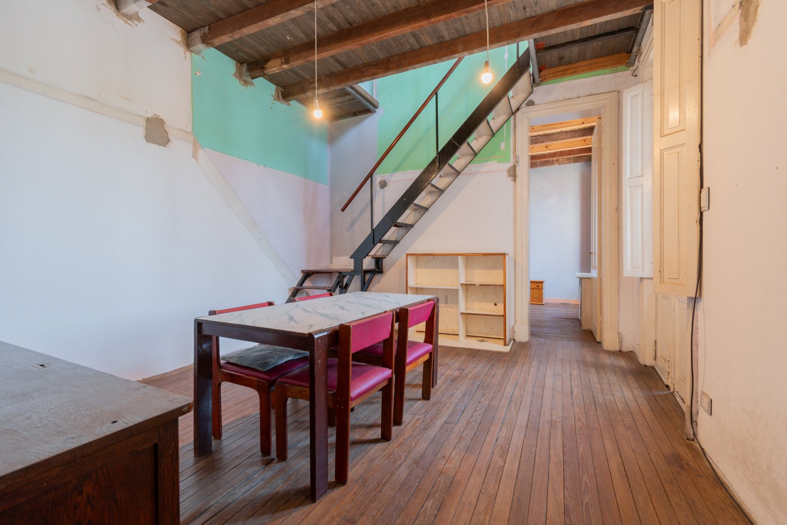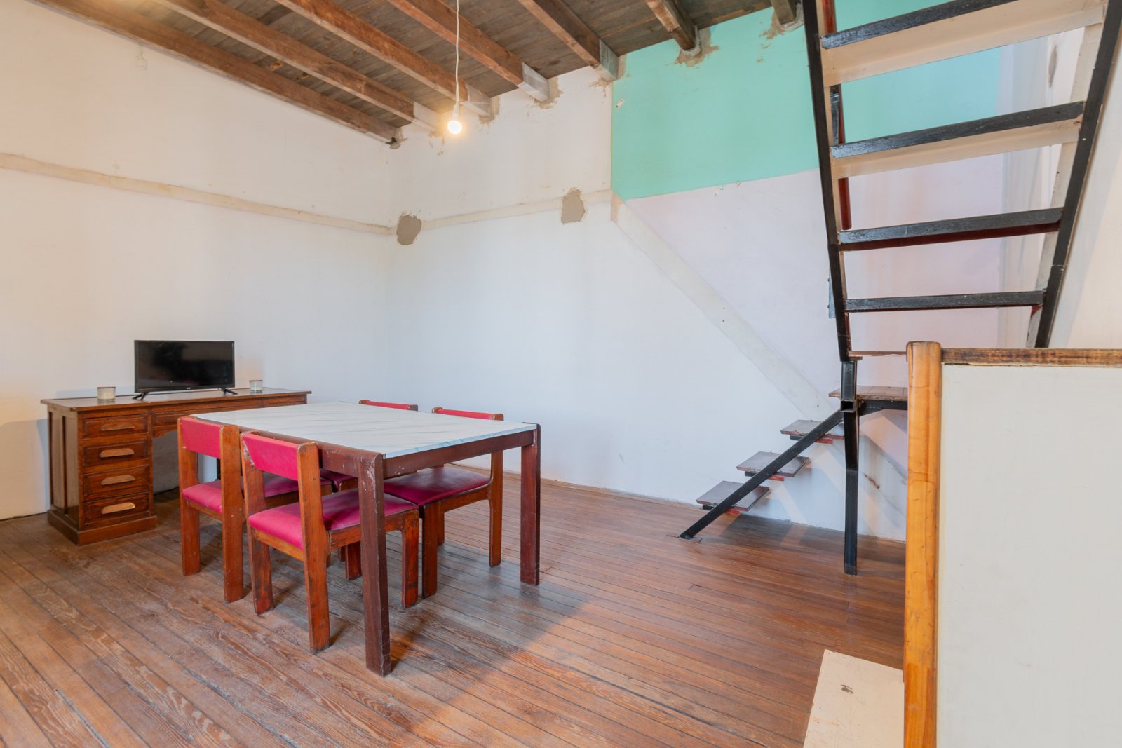 En primer piso por escalera: cocina, estar-comedor, lavadero, baño y habitación principal con vestidor. Galería, patio con espacio cubierto para guardado. Piso de madera en habitación y estar. Carpinterías originales.