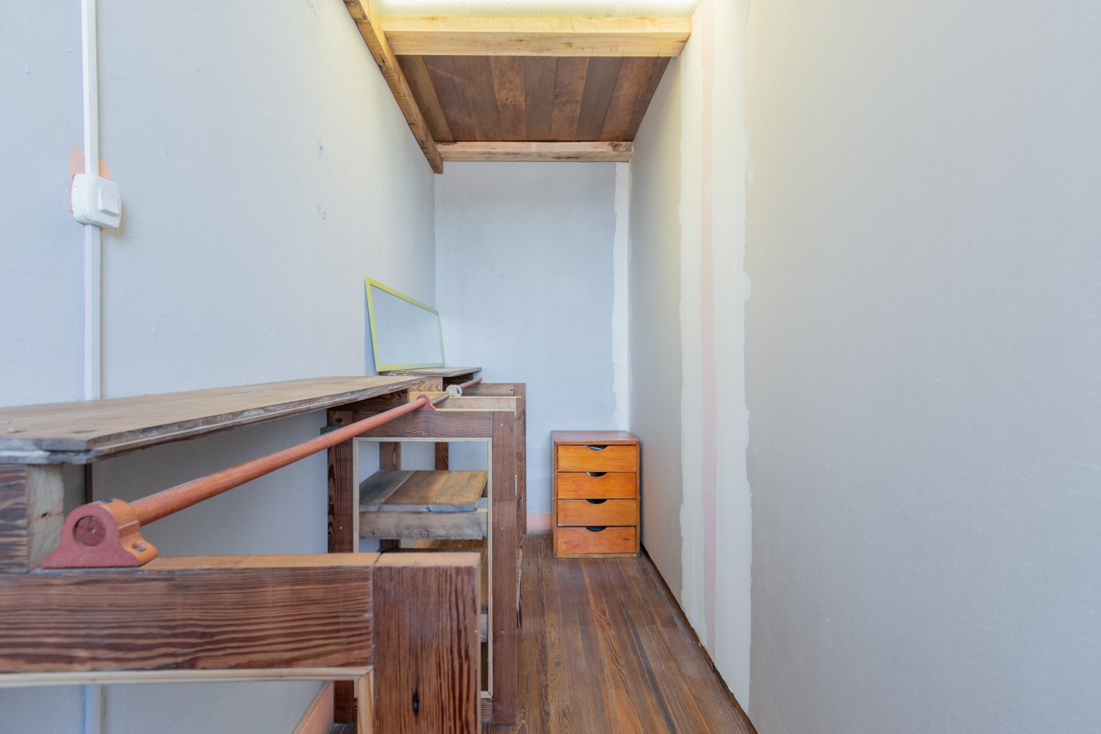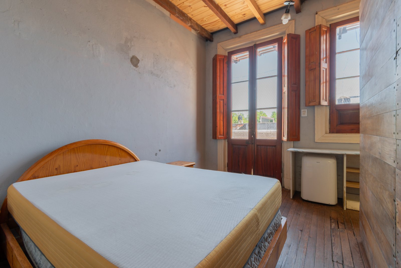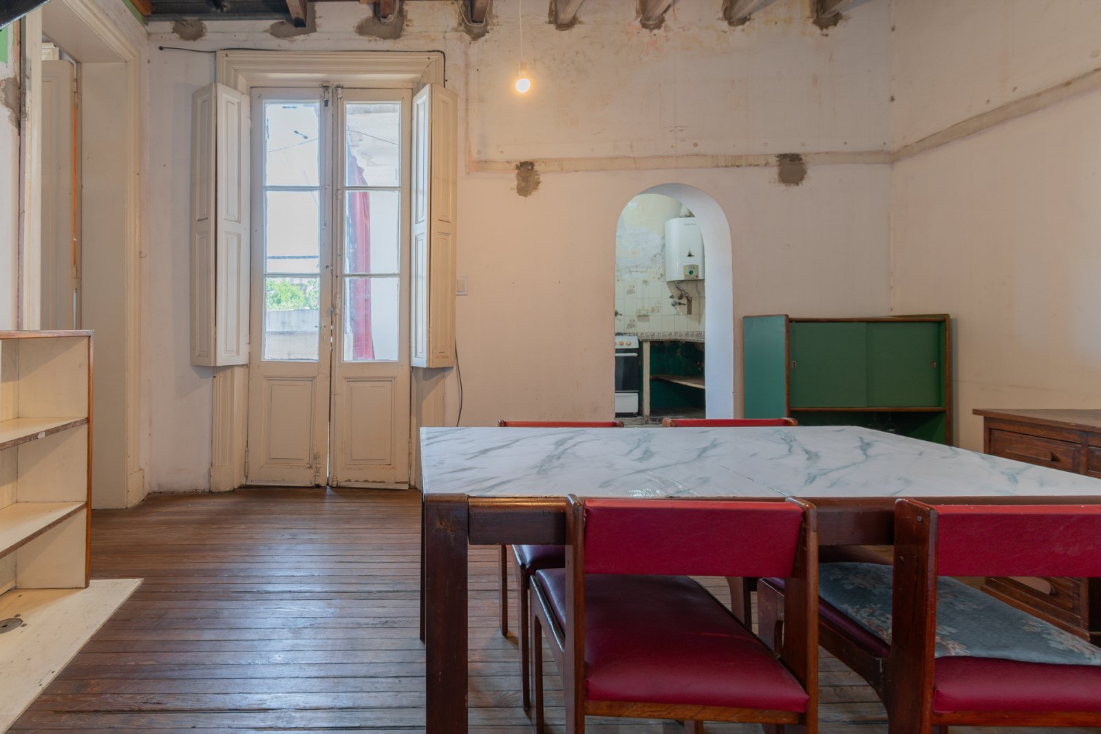 En primer piso por escalera: cocina, estar-comedor, lavadero, baño y habitación principal con vestidor. Galería, patio con espacio cubierto para guardado. Piso de madera en habitación y estar. Carpinterías originales.