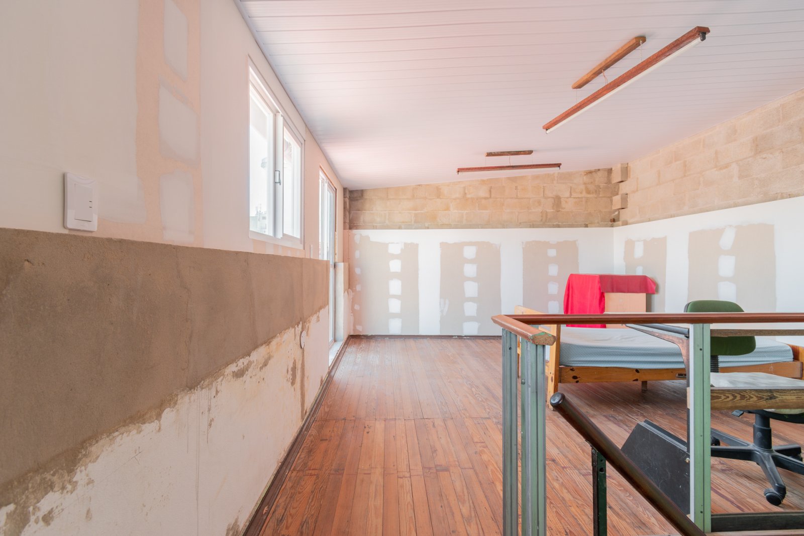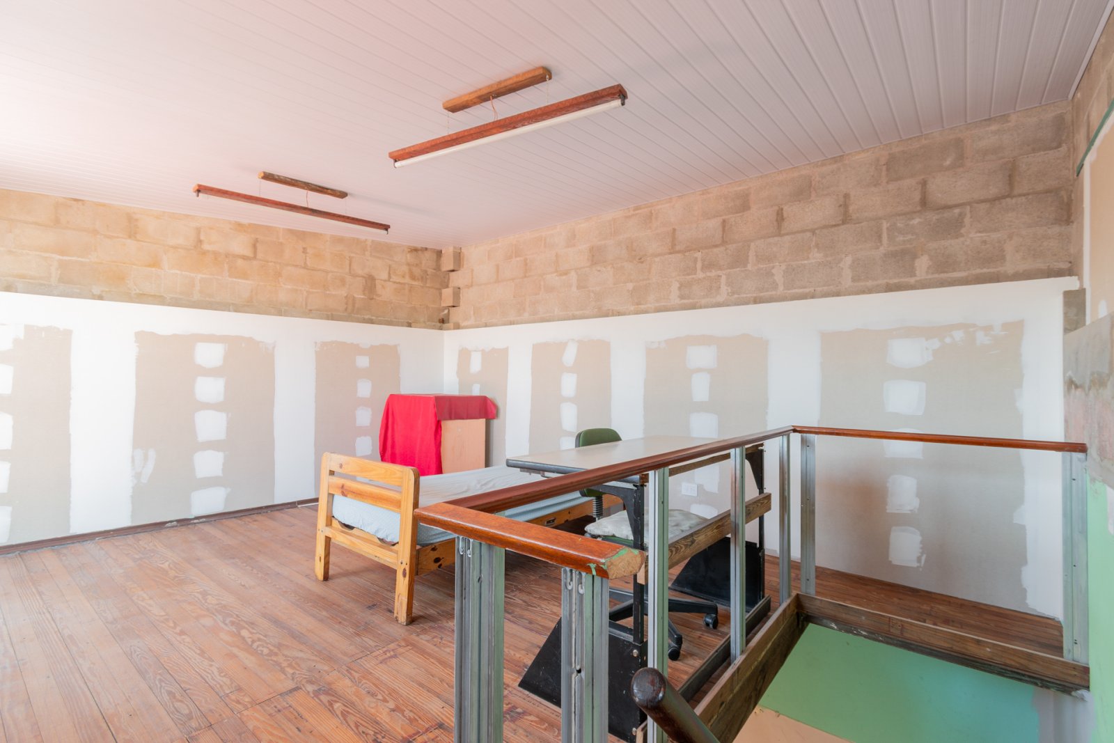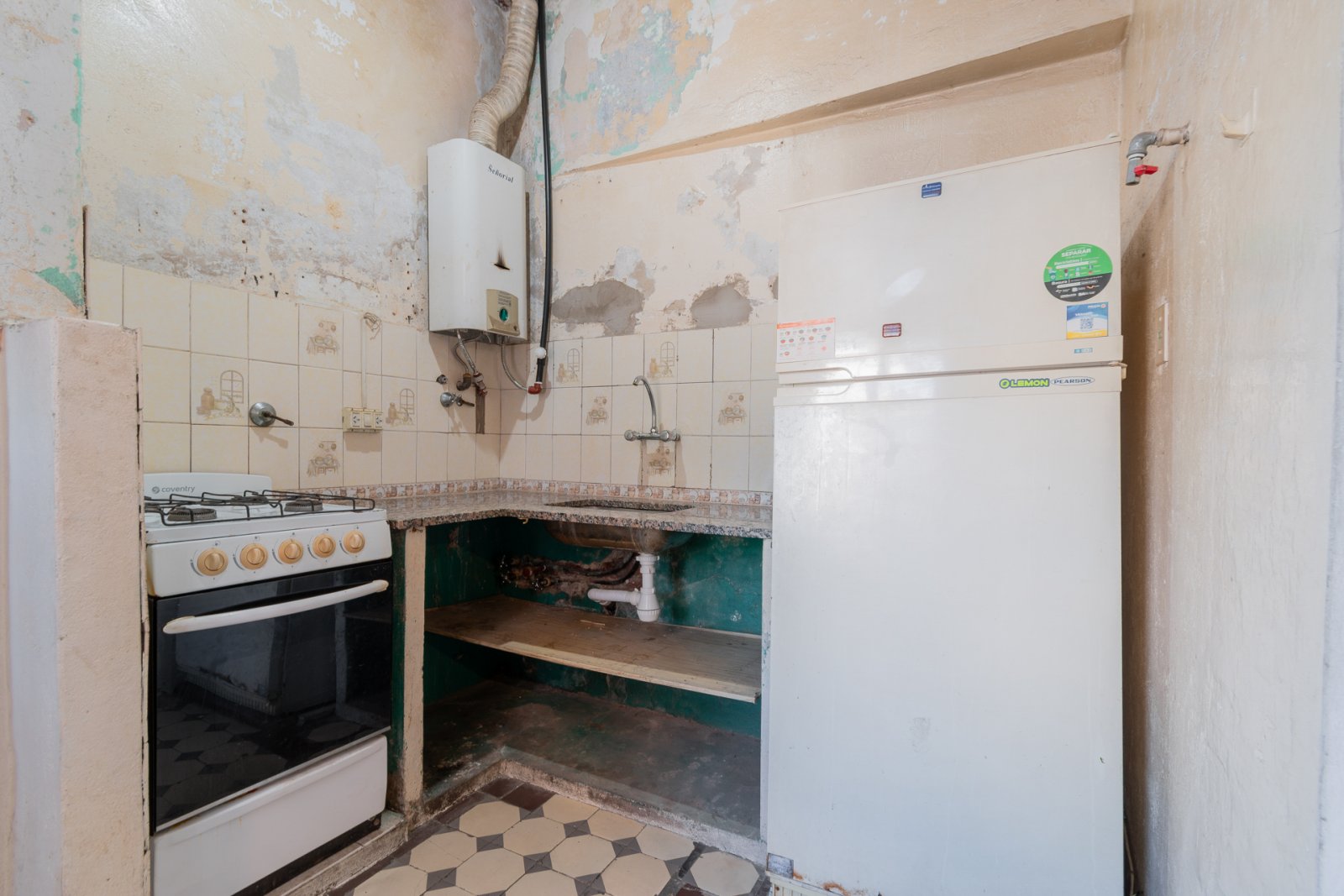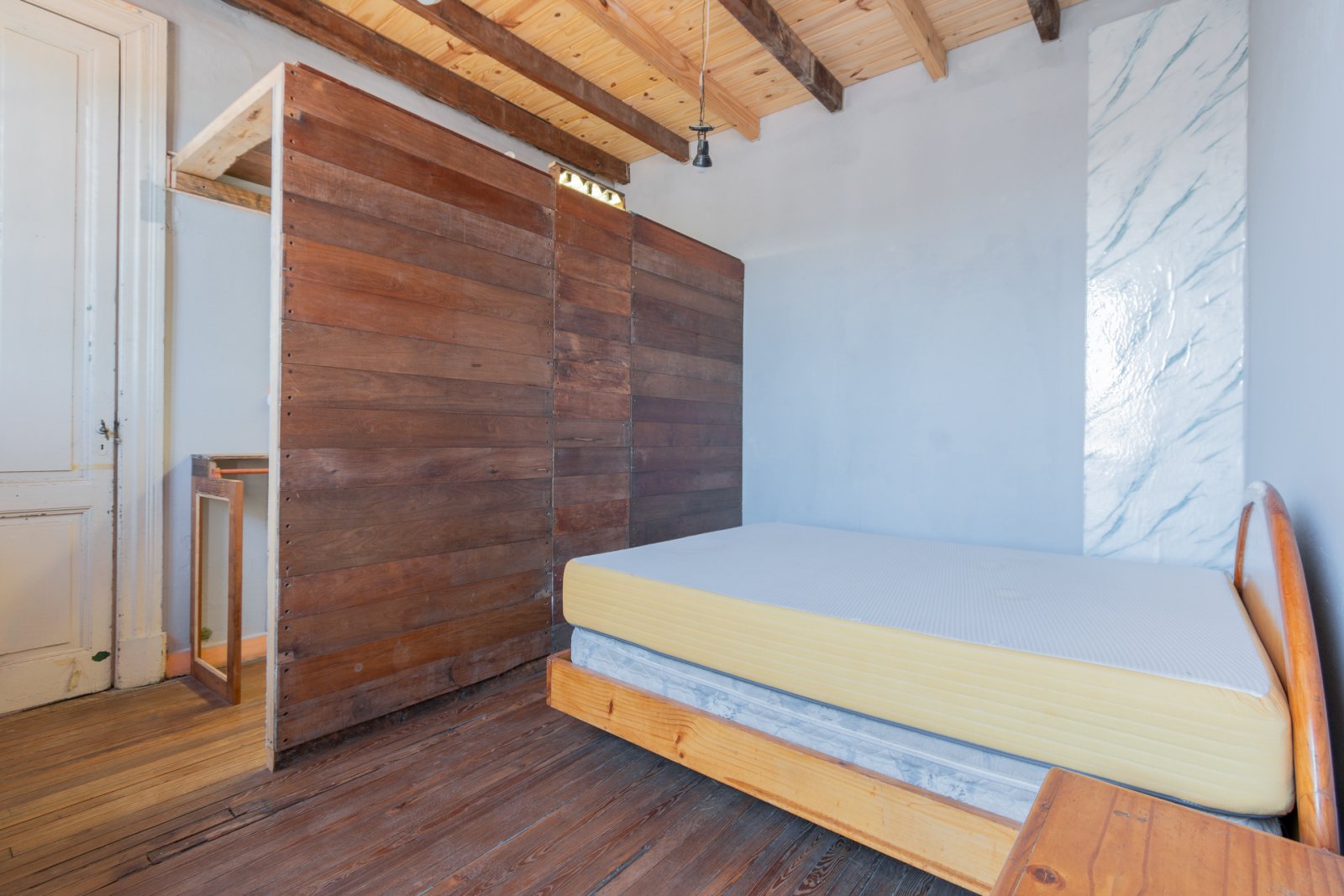 En primer piso por escalera: cocina, estar-comedor, lavadero, baño y habitación principal con vestidor. Galería, patio con espacio cubierto para guardado. Piso de madera en habitación y estar. Carpinterías originales.