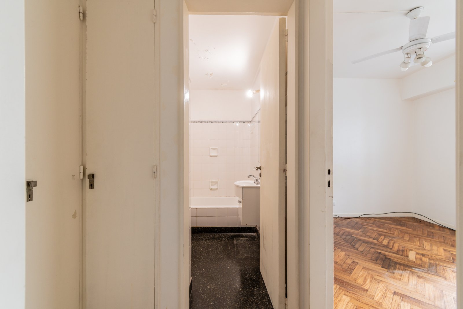 Departamento 2 ambientes. Ubicado en 3° piso, disposición interna. Hall de ingreso. Cocina independiente, amplia y con gran capacidad de guardado. Lavadero separado con bacha instalada y ventilación natural. Living comedor y habitación con pisos de madera. Pasillo de distribución con placard empotrado. Baño completo con bañera.